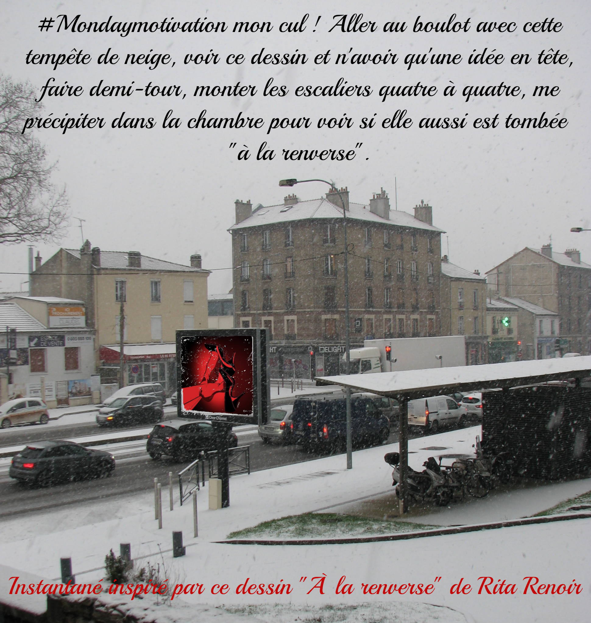 #Mondaymotivation mon cul ! Aller au boulot avec cette tempête de neige, voir ce dessin et n’avoir qu’une idée en tête, faire demi-tour, monter les escaliers quatre à quatre, me précipiter dans la chambre pour voir si elle aussi est tombée « à la renverse ».